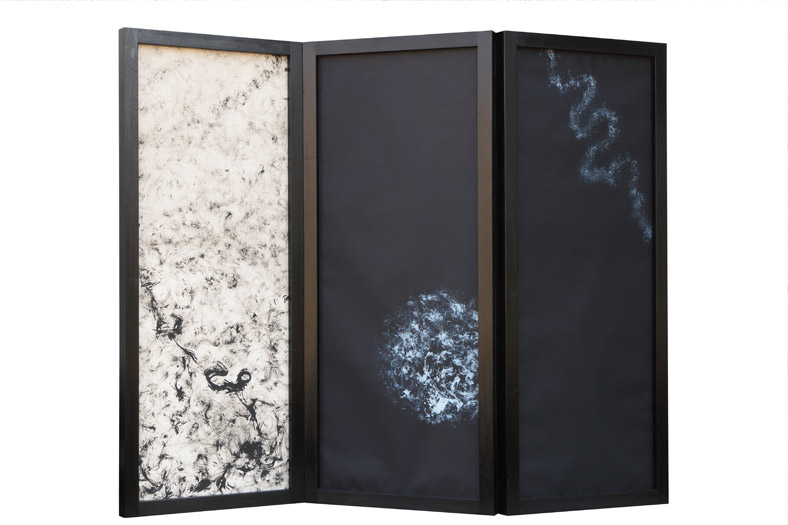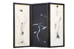 Paravento con telaio in legno laccato. Inchiostro o pastello su carta. Ogni anta ha due facce, le tavole sono perciò 6, tre per ogni lato.